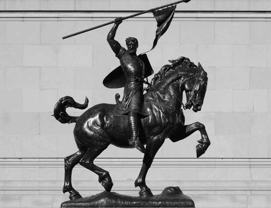 Charles Pratt Huntington also designed the American Numismatic Society (1907), the American Geographical Society (1910), and the Museum of the American Indian-Heye Foundation (1916), as well as the Catholic Church of Nuestra Señora de la Esperanza (1912), with later alterations by the architecture firm of McKim, Meade & White. McKim, Meade & White also designed the American Academy of Arts and Letters (1923), although the subsequent addition was completed by Cass Gilbert (1930). The American Geographical Society, the Museum of the American Indian-Heye Foundation, and the American Numismatic Society subsequently relocated. Boricua College acquired the American Geographical Society building in 1980, the Museum of the American Indian-Heye Foundation building was purchased by the Hispanic Sociaty in 1996, and the American Academy of Arts and Letters purchased the American Numismatic Society building in 2005. In addition to the impressive Beaux Arts/American Renaissance architecture, the terrace features a selection of sculptures by Anna Hyatt Huntington. From the beginning Huntington had intended to add sculpture to the buildings and to ensure their permanence by making them monumental works of art. Following his marriage to the sculptor Anna Vaughn Hyatt in 1923, plans for adding sculpture to Audubon Terrace began to take shape. Dominating the central space of the Hispanic Sociaty’s lower terrace is the monumental bronze equestrian statue of El Cid Campeador. The first casting was presented by the Huntingtons to the city of Seville. The first replica was placed in the central court of the lower terrace on August 15, 1927. Four life-size bronze seated warriors leaning on shields were added to complete the ensemble. Additional sculptures by Anna Hyatt Huntington on the terrace include a red stag and red doe with fawn in bronze; two heraldic limestone lions with globes between their paws guard the entrance to the Museum and Library; and four limestone groups of bears, jaguars, vultures, and wild boars flank the top of the steps up to the terraces on each side of the North Building. Two monumental limestone equestrian sculpture reliefs on the façades of the North Building complete the sculptural program on the terrace: Boabdil, the last Nasrid king of Granada; and Don Quixote, whose crestfallen posture, broken staff, and gaunt horse Rocinante stand in stark contrast to El Cid’s vigorous stance and noble steed.