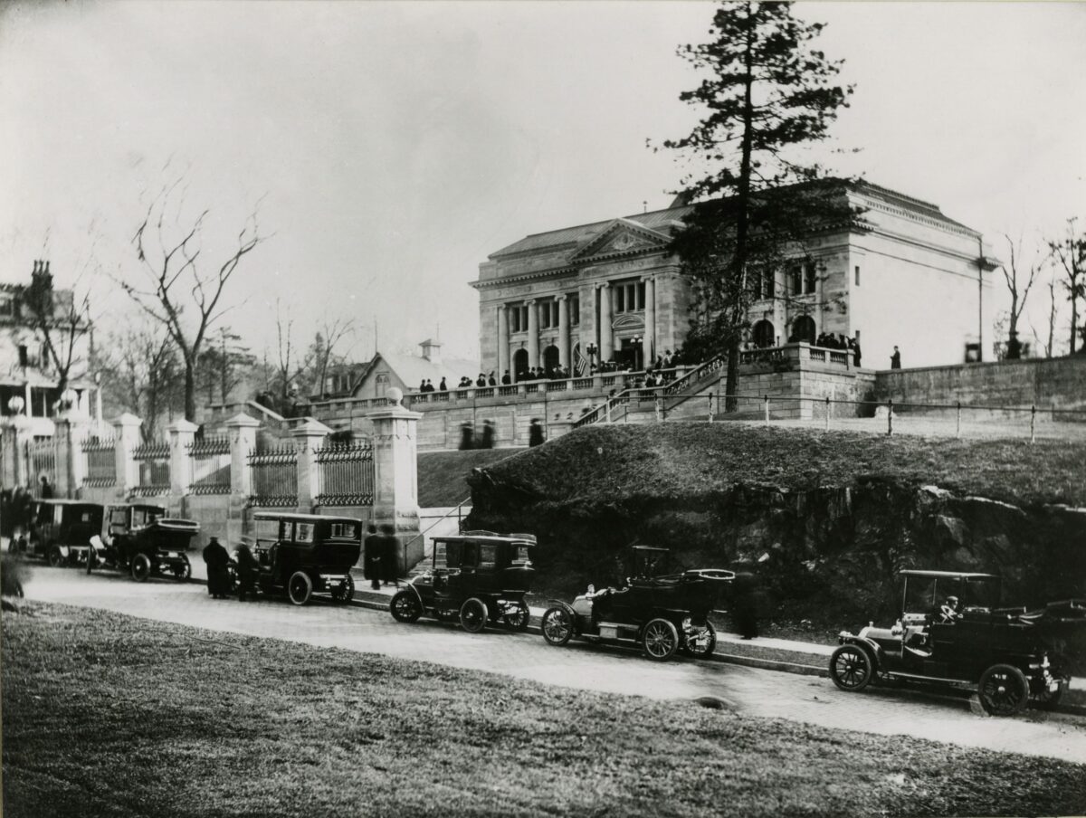 Following the completion of the Hispanic Sociaty’s building in 1905, Huntington offered adjoining parcels to other cultural institutions with which he was associated and then subsidized the construction of their buildings in a uniform Beaux Arts/American Renaissance style. In the early years visitors reached the Museum and Library from 156th Street, passing through lofty iron gates, each decorated with the seal of the Hispanic Sociaty, and then mounting terrace steps to the building. By 1910 Huntington’s cultural campus had begun to take shape with the addition of the American Numismatic Society and the American Geographical Society. To provide access from Broadway to the new institution, terraces were added and the property was renamed Audubon Terrace. The Main Building of the Hispanic Sociaty, designed by Charles Pratt Huntington, was the first to be completed on the terrace in 1905, and the Museum and Library opened to the public in 1908. Subsequently, east and west wings were added in 1915 for the Sorolla Gallery and in 1921 for the Library Reading Room, and the North Building was opened in 1928.