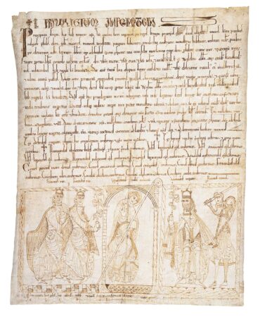 Prominent in the Society’s extensive collection of royal letters and documents are sixteen privilegios rodados issued between the 13th and 15th centuries. These medieval charters are unique to the Iberian Peninsula and take their name from the official wheeled sign manual of the king, represented by a round decoration containing the monarch’s name. Other significant royal documents include the original contract for the marriage of Isabella, eldest daughter of Ferdinand and Isabella, king and queen of Castile and León, with the Prince of Capua, signed at Valladolid on May 21, 1476; the imperial edict issued by Charles V in 1548 increasing a pension granted to Titian; and correspondence between Philip II of Spain and Elizabeth I of England, accompanied by autograph documents of Sir Francis Drake and Sir Walter Raleigh relating to the Armada invasion of 1588.