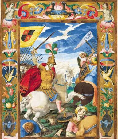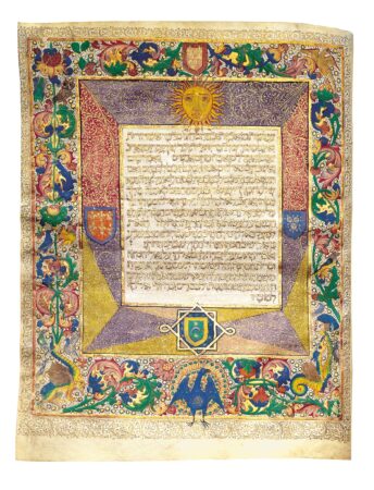Catholic liturgical manuscripts, particularly antiphonaries and graduals, exhibit styles of illumination unique to Spain. The set of ten late 15th-century choir books from the Convent of Santa Clara at Belalcázar (Córdoba) contains prime examples of Mudéjar-style illumination, characterized by the use of the geometrical ornaments popularized in the art and architecture of Muslim Spain. Secular manuscripts, such as the cartas ejecutorias de hidalguía, or patents of nobility that certified the noble lineage of the recipient, offer a significant survey of the arts of bookbinding and manuscript illumination in Spain from the late 15th through 18th centuries. Some of the most striking within the Hispanic Sociaty’s impressive collection of over six hundred cartas ejecutorias are those of the 17th century that include illuminated portraits of the recipient’s family. The image of Antonio de Contreras and his family in a carta ejecutoria issued by Philip IV at Valladolid in 1651 recalls comparable court portraiture and shows how contemporary illuminators understood the style of Velázquez.