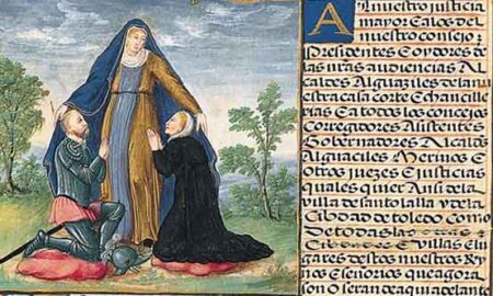 Medieval charters, holograph royal letters, sailing charts from the Age of Exploration, letters patent of nobility, illuminated Bibles, books of hours, choir books, as well as celebrated historical, scientific, and literary manuscripts are but a few of the treasures to be found in the manuscript collection. Perhaps better known for its collection of literary manuscripts, the Hispanic Sociaty has an even broader collection of historical documents, many of them dating from the Middle Ages. One of the earliest is a privilegio (grant) issued by Alfonso VII, king of Castile and León (1104–1157), at Toledo circa 1150, conveying the valley of Santa María de San Martín de Valdeiglesias to a Cistercian monastery of the same name. At the foot of the document, a miniature triptych shows the figures of Alfonso VII, his sons, his majordomo, and the abbot Willielmus.