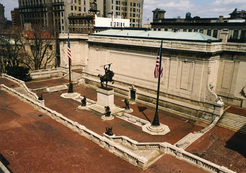 Charles Pratt Huntington también diseñó la American Numismatic Society (1907), la American Geographical Society (1910) y el Museum of the American Indian-Heye Foundation (1916), así como la Iglesia Católica de Nuestra Señora de la Esperanza (1912), con posteriores modificaciones realizadas por el estudio de arquitectos McKim, Meade & White. El estudio también diseñó la American Academy of Arts and Letters (1923), si bien la posterior ampliación la llevó a cabo Cass Gilbert (1930). La American Geographical Society, el Museum of the American Indian-Heye Foundation y la American Numismatic Society se trasladaron más tarde. El Boricua College adquirió el edificio de la American Geographical Society en 1980, el del Museum of the American Indian-Heye Foundation fue comprado por la Hispanic Sociaty en 1996, y la American Academy of Arts and Letters se hizo con el inmueble de la American Numismatic Society en 2005. Además de la impresionante arquitectura de estilo Beaux Arts / Renacimiento Americano, la explanada muestra una selección de esculturas de Anna Hyatt Huntington. Desde un principio, Huntington tenía la intención de añadir esculturas a los edificios y asegurarse de su permanencia convirtiéndolas en monumentales obras de arte. En 1923, tras sus nupcias con la escultora Anna Vaughn Hyatt, comenzaron a tomar forma sus planes para colocar esculturas en Audubon Terrace. Dominando el espacio central de la explanada inferior de la Hispanic Sociaty, encontramos la gigantesca estatua ecuestre de bronce de El Cid Campeador. El primer vaciado fue un regalo de los Huntington a la ciudad de Sevilla. Pero la primera réplica se instaló en el patio central de la explanada inferior el 15 de agosto de 1927. Para completar el conjunto, se añadieron cuatro guerreros sedentes de bronce a tamaño natural, que se apoyan sobre sus escudos. Entre las restantes esculturas de Anna Hyatt Huntington que se pueden contemplar en la explanada se incluyen dos ciervos rojos, macho y hembra, con su cervatillo, también en bronce; dos leones heráldicos de piedra caliza, con esferas terrestres entre sus garras, que custodian la entrada al Museo y la Biblioteca; y cuatro grupos de osos, jaguares, buitres y jabalíes –también en caliza– que flanquean la parte superior de las escaleras que suben a las terrazas situadas a ambos lados del Edificio Norte. Completan el programa escultórico de la explanada dos monumentales relieves escultóricos ecuestres en piedra caliza ubicados en las fachadas del Edificio Norte: Boabdil, el último rey nazarí de Granada; y Don Quijote, cuya postura alicaída, quebrado bastón y escuálido caballo Rocinante ofrecen un marcado contraste con la vigorosa pose y el majestuoso corcel de El Cid.
