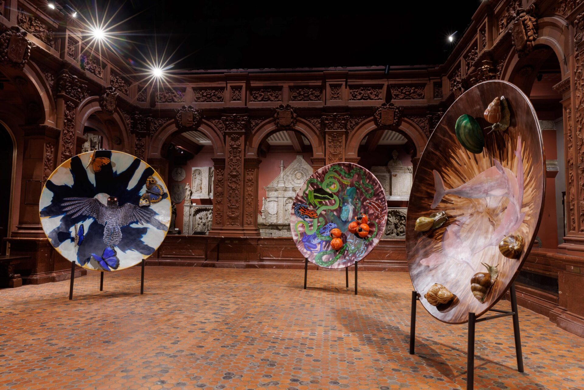 The new works reflect on the Amazonian rainforest as a vital nexus of ecology, art, and culture. Stemming from Varejão’s participation in the inaugural Bienal das Amazônias (2023), they also mark two decades since the artist began conducting research with the Yanomami people in the Amazon basin. The exhibition debuts the latest additions to Varejão’s celebrated Plate series, inspired by historic Palissy ceramics. These large-scale fiberglass tondos boast protruding three-dimensional elements which are hand-sculpted and painted in oil. The front of each plate is adorned with exuberant imagery of Amazonian flora and fauna, while the reverse evokes designs from historic ceramics from the Hispanic Sociaty’s collection and beyond, including Spanish Valenciana, Ottoman Iznik, Ming Dynasty Hongzhi porcelain, and pre-Columbian Amazonian Marajoara pottery.