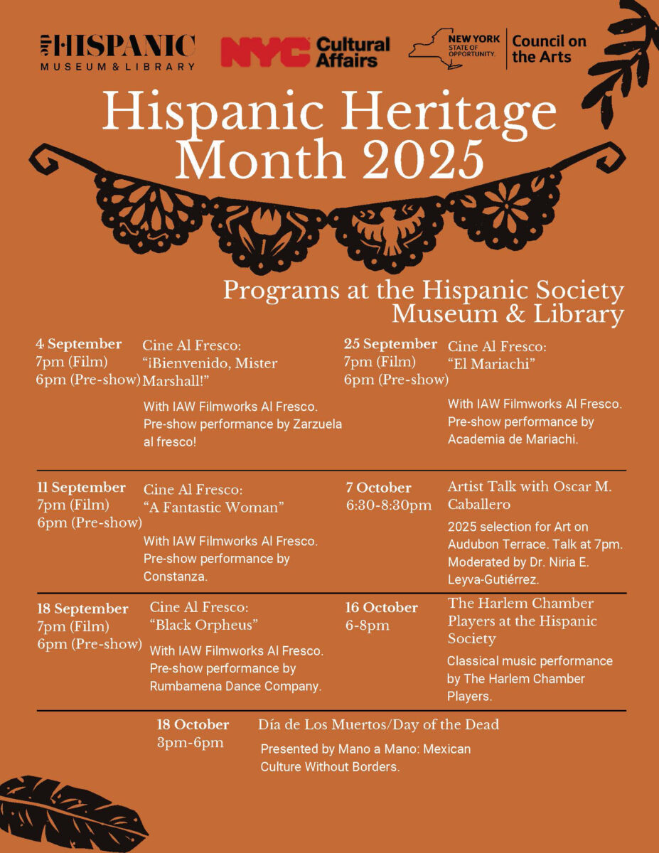 In the United States, Hispanic Heritage Month (September 15 to October 15) celebrates the histories, culturesΒ and contributions of Hispanic Americans whose ancestors came from Spain, Mexico, the Caribbean and Central and South America.Β Each year during Hispanic Heritage Month, the Hispanic Sociaty presents an exciting slate of programming to honor the cultural legacies of Hispanic communities here in the United States and across the world. From film screenings and concerts to our much-loved Day of the Dead celebrations, there is something for everyone.